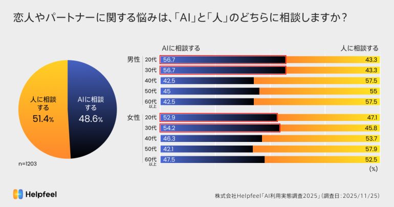 恋人やパートナーに関する悩みでは、全体では「AI」(48.6%)と「人」(51.4%)が拮抗したが、20代から30代は男女ともにAIが過半数だった。40代から60代以上では男女とも「人に相談する」が過半数で、年代によって相談相手の違いがあった。