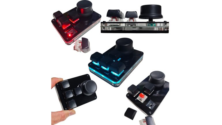 「TinyKeyBoard5」は、4つのボタンと1つのボリュームノブを備えた片手デバイス。面倒なドライバーインストールは不要で、同社提供の専用アプリを使い、画面上のキーGUIをクリックするだけで直感的にキーマップをカスタマイズ可能。設定はキーボードの本体に保存されるため、一度設定すればほかのPCでもすぐに使用できる。