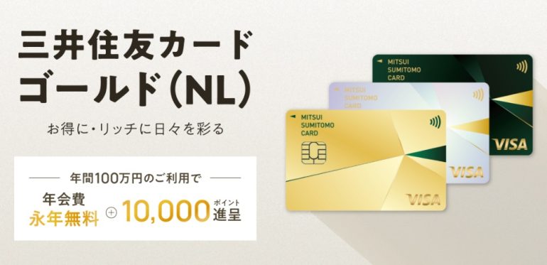 三井住友銀行のゴールド(NL)会員は、通常年会費が5,500円かかるが、年間100万円利用すると永年無料になる。しかも、1万ポイントがもらえる。初年度だけでなく、年間100万円を達成すると、2年目も1万ポイント、3年目も1万ポイントがそれぞれもらえる。