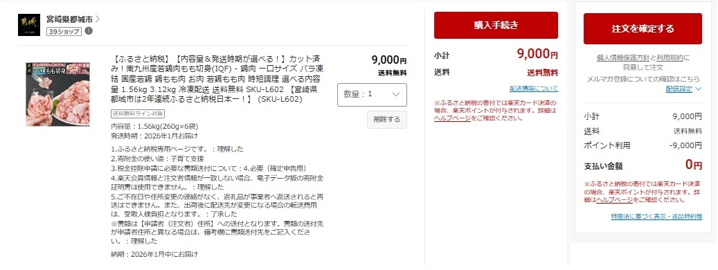 そして、ふるさと納税では、楽天市場の買い物などでたまっていた楽天ポイントと合わせて、9,000円分の寄附金をすべてポイント払いにしている。