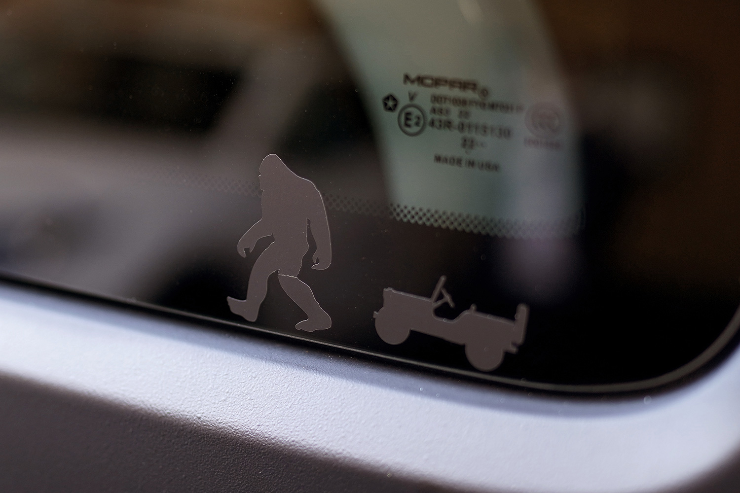これらのデカールは、米国のプロダクトデザインチームと共同で制作された。左リアガラスには、ジープの原点ともいえるWillys MB(ウィリス エムビー)と雪男が並んで歩くシルエットが施されるなど、遊び心あふれるディテールも加えられている。