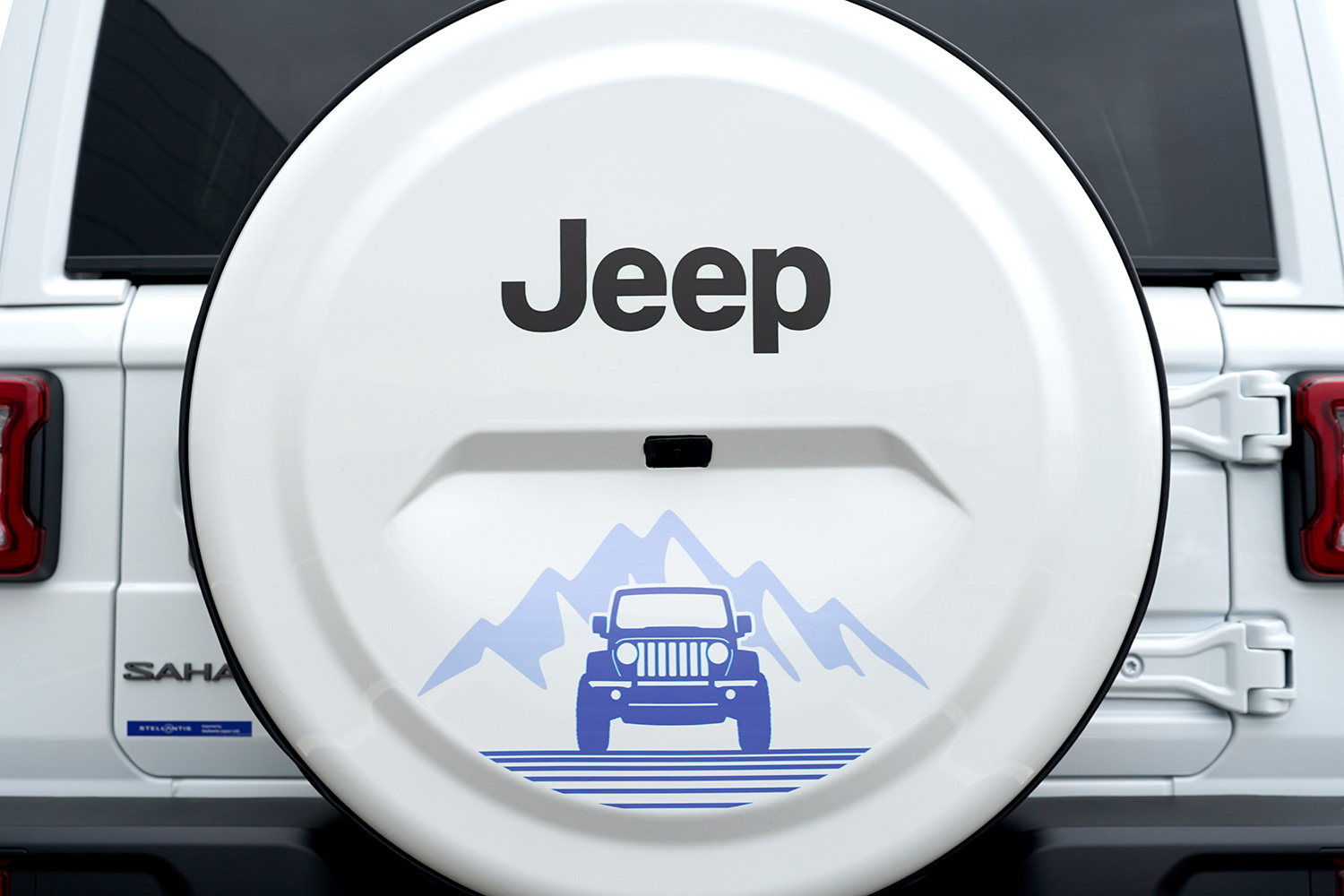 また、車両の背面には、Wranglerのイラストをプリントしたホワイトのハードタイプスペアタイヤカバーを装備し、Jeep ロゴ入りのホワイトドアミラーキャップとあわせて、白銀の世界をイメージした一体感のある仕上がりとなっている。