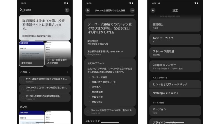 ただし、残念ながらEssential Spaceは端末内で完結してしまうため、他のNothing PhoneやPCなどとの同期ができない。そのため、重要なスケジュールを登録してしまうと、大切な用事を見逃してしまうおそれもあり、少々使い勝手が悪い。現時点では、どちらかと言えば、Googleカレンダーに登録するまでもない、ちょっとした要件を入力しておくのに向いた機能と言えそうだ。