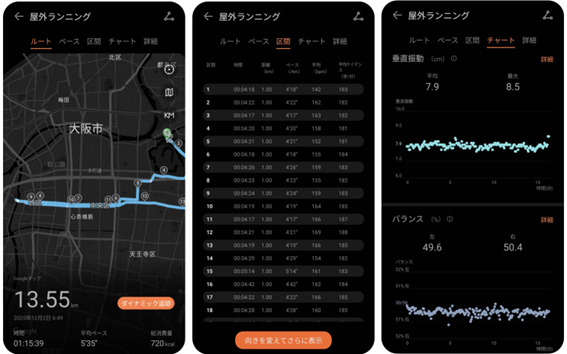さらに、ランニングウォッチに求めるものとして、走行中のデータの計測も重要だが、それと同じぐらい大事なのが「走行データの分析・振り返り」だ。「HUAWEI WATCH GT 6」の走行データの詳細はスマホアプリ「Huaweiヘルス」で確認でき、ペースや心拍数だけでなく、「左右のバランス」「垂直振動」「設置時間」「ケイデンス(ピッチ数)」なども表示されるため、自分の「走りの癖」などを可視化してくれる。