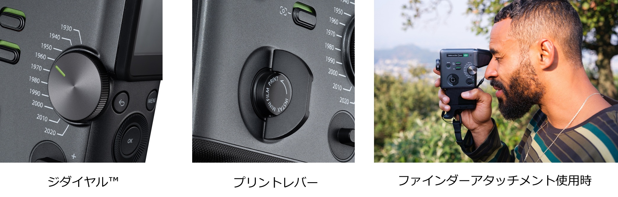 このほか、同社が1965年に発売した8mmカメラの“フジカ シングル-8”を彷彿とさせる縦持ちスタイルを採用しているのも特長で、指先に伝わるクリック感が魅力の「ジダイヤル」や、フィルムを手で巻き上げるような感覚で操作できる「プリントレバー」など、細部までこだわったデザインとアナログな操作感が撮影とプリントの楽しみを広げる。