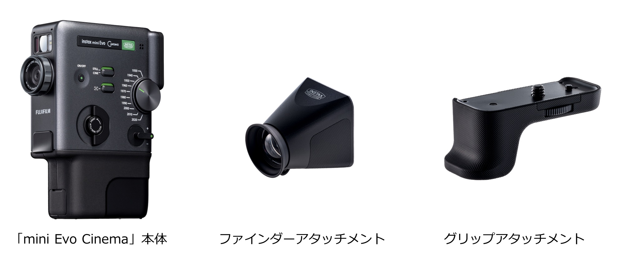 本体サイズは39.4×132.5×100.1mm(突起部除く)、質量は約270g(フィルムカートリッジ、記録メディア含まず)。ファインダーアタッチメント、グリップアタッチメントなどが付属する。