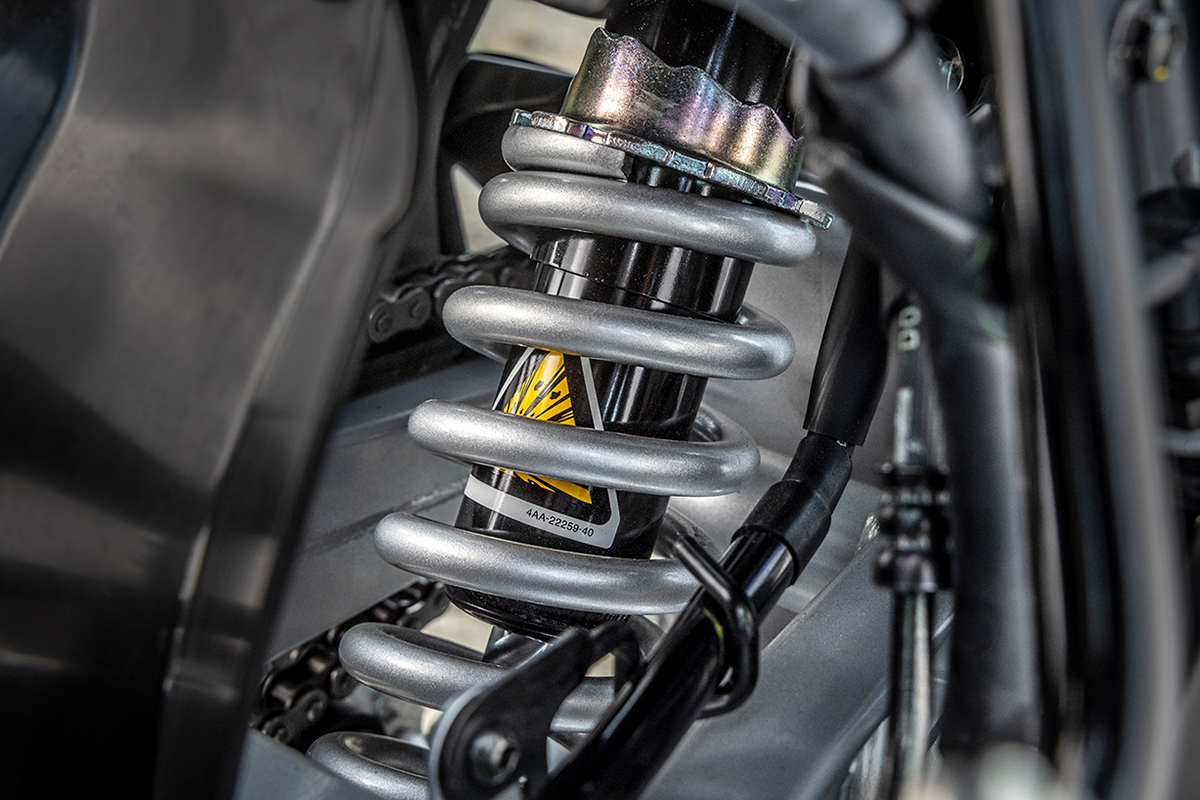 一方リアには、リンク式のモノクロスサスペンションを採用。リアアームとクッションユニット間にリンク構造を組み込むことで、レバー比を変化させ、ソフトな乗り心地と高荷重時での優れたダンピング特性を合わせて実現している。