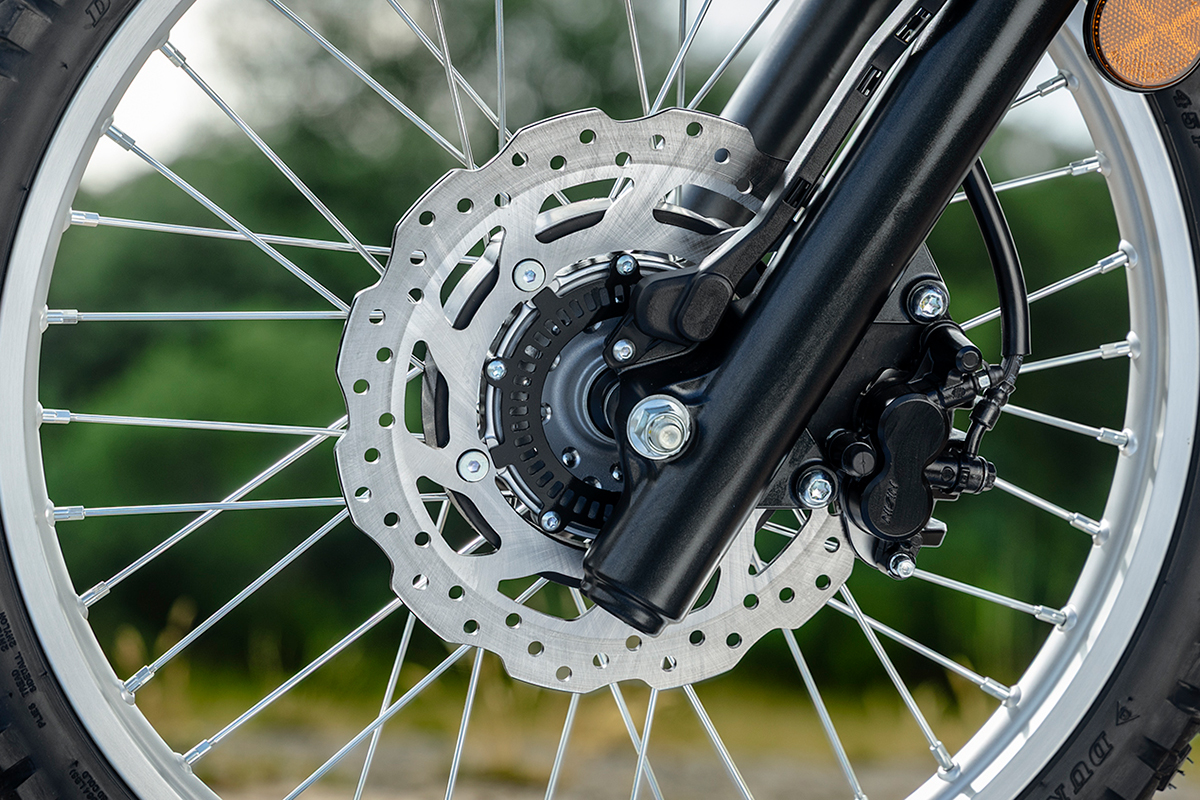 フロントブレーキはφ267mmディスクローターと2ポットキャリパー、リアはφ220mmディスクローターとシングルポットキャリパーを組み合わせている。いずれも、パッド材質など摩擦系と、レバー比などの入力系との相互バランスを整えており、オフロードからオンロードまでさまざまなシーンで、コントロール性に優れた制動力を発揮。なおフロントブレーキには、ABSが装備されている。