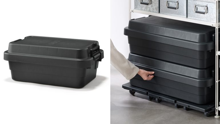 ベランダやアウトドアなどの屋外でも使用できる収納ボックスで、フタの耐荷重が約100kgあるため、簡易的な腰掛けとしても使用可能。車の荷台などの限られたスペースや棚下などのデッドスペースにも収納しやすいサイズで、防災アイテムや食品ストック、レジャー用品などの保管に好適だ。