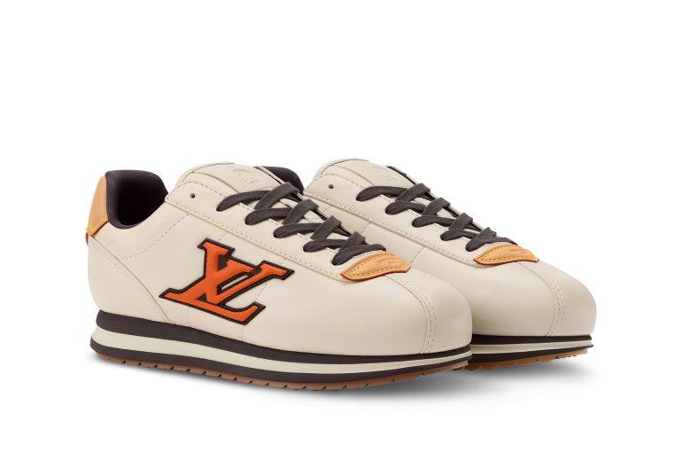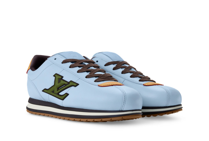メゾンが誇るイタリア人アルチザンたちの技術によってクッション性の高いアッパーを作り上げ、ルイ・ヴィトンを象徴するヌメ革のトリミングとLV イニシャルのシグネチャーをあしらい、シュータンにはメンズ クリエイティブ・ディレクター ファレル・ウィリアムスの横顔が配されている。