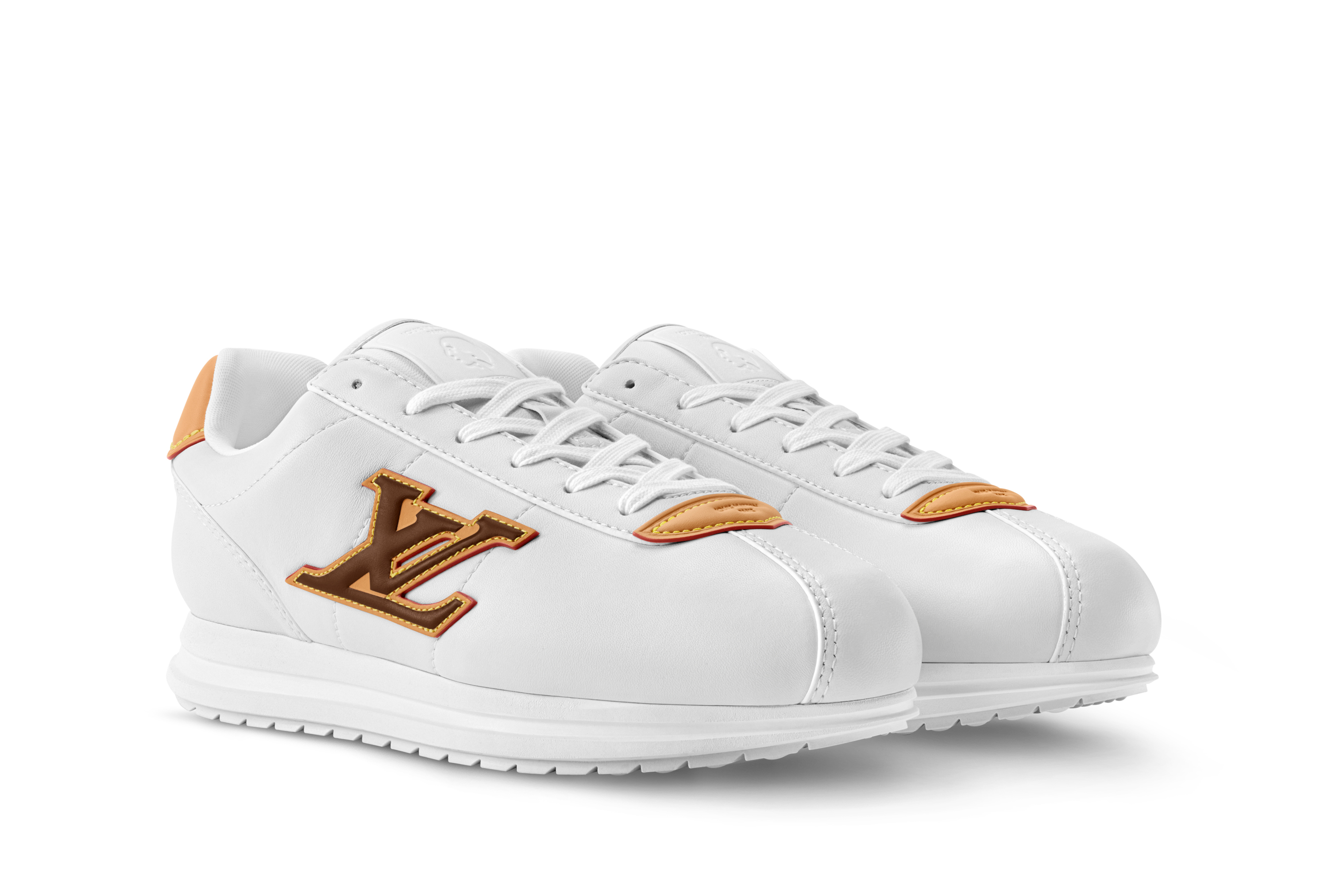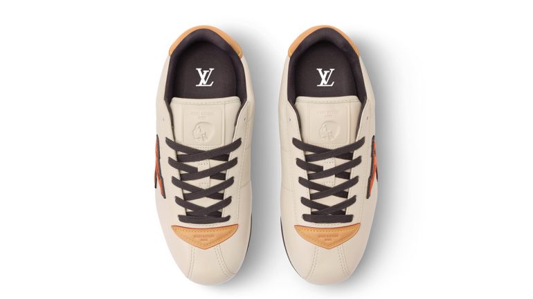 メゾンが誇るイタリア人アルチザンたちの技術によってクッション性の高いアッパーを作り上げ、ルイ・ヴィトンを象徴するヌメ革のトリミングとLV イニシャルのシグネチャーをあしらい、シュータンにはメンズ クリエイティブ・ディレクター ファレル・ウィリアムスの横顔が配されている。
