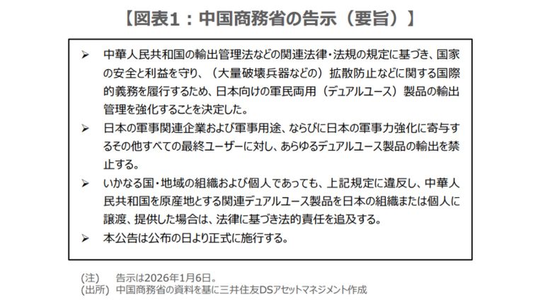 中国商務省は1月6日、輸出管理法などの規定に基づき、日本向けの軍民両用(デュアルユース)製品の輸出管理を強化すると発表した(図表1)。