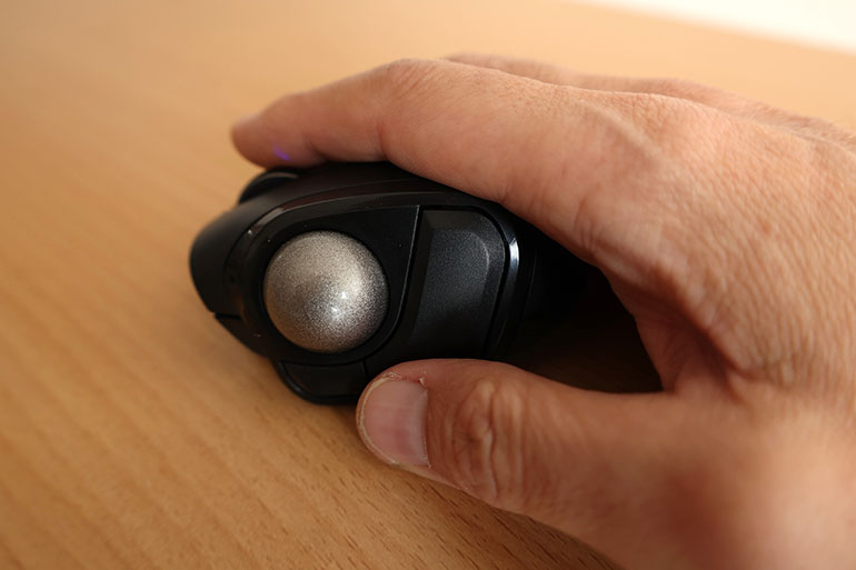 まず、親指操作タイプから。ボールの直径は25mmと小さめだが、操作性に問題は感じない。センサー分解能は、高すぎず低すぎずの750DPIなのも良い。