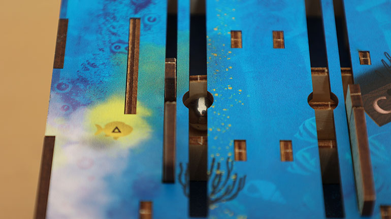 上面が、馴染み深い玉転がしパズルになっているが、そこには玉はない。でも、これがかすかなヒントになる。つまり、どこかの時点で、そこに玉を送り込むのである。