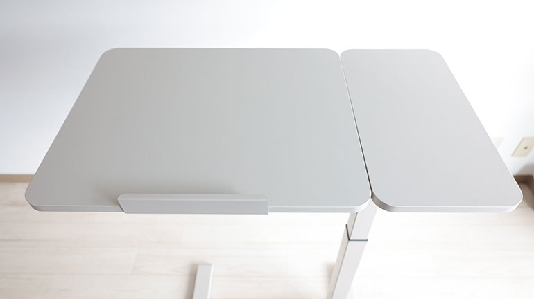 また、水平での使用時は、不意に傾斜しないよう、天板裏の安全ピンでロックしておける。サイド天板には角度調整機能はなく、コップなど傾斜不要のアイテムはここへ。