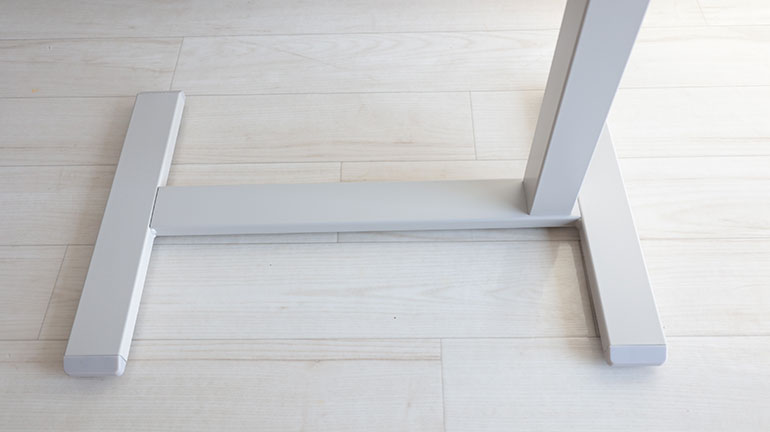 天板を支える支柱は、スチール製の一本脚となっており、フラットなH型ベースで安定をはかるタイプ。ベースの四隅には360度回転するキャスターが備わっていて、室内での移動がスムーズに行える。