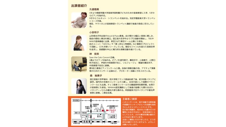 本イベントは収益の全額を、日頃から野良猫を保護したり避妊・去勢を施してその繁殖を食い止め、不幸な命が増えないよう地道に活動している保護団体に寄付するために企画されたチャリティーコンサート。