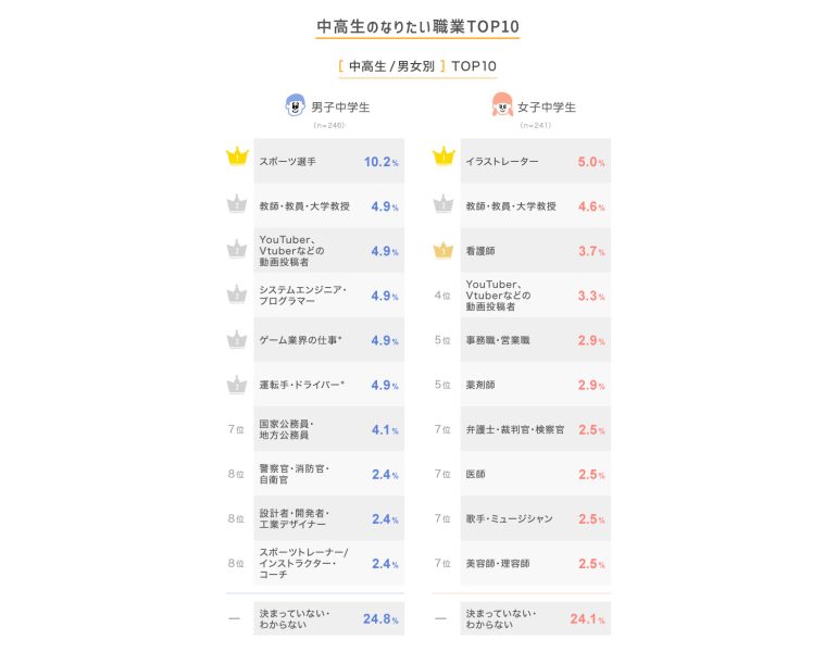 同率2位には、「教師・教員・大学教授」「YouTuber、Vtuberなどの動画投稿者」「システムエンジニア・プログラマー」「ゲーム業界の仕事(ゲームデザイナー、ゲームクリエイターなど)」「運転手・ドライバー(鉄道、タクシーなど)」が並んだ。