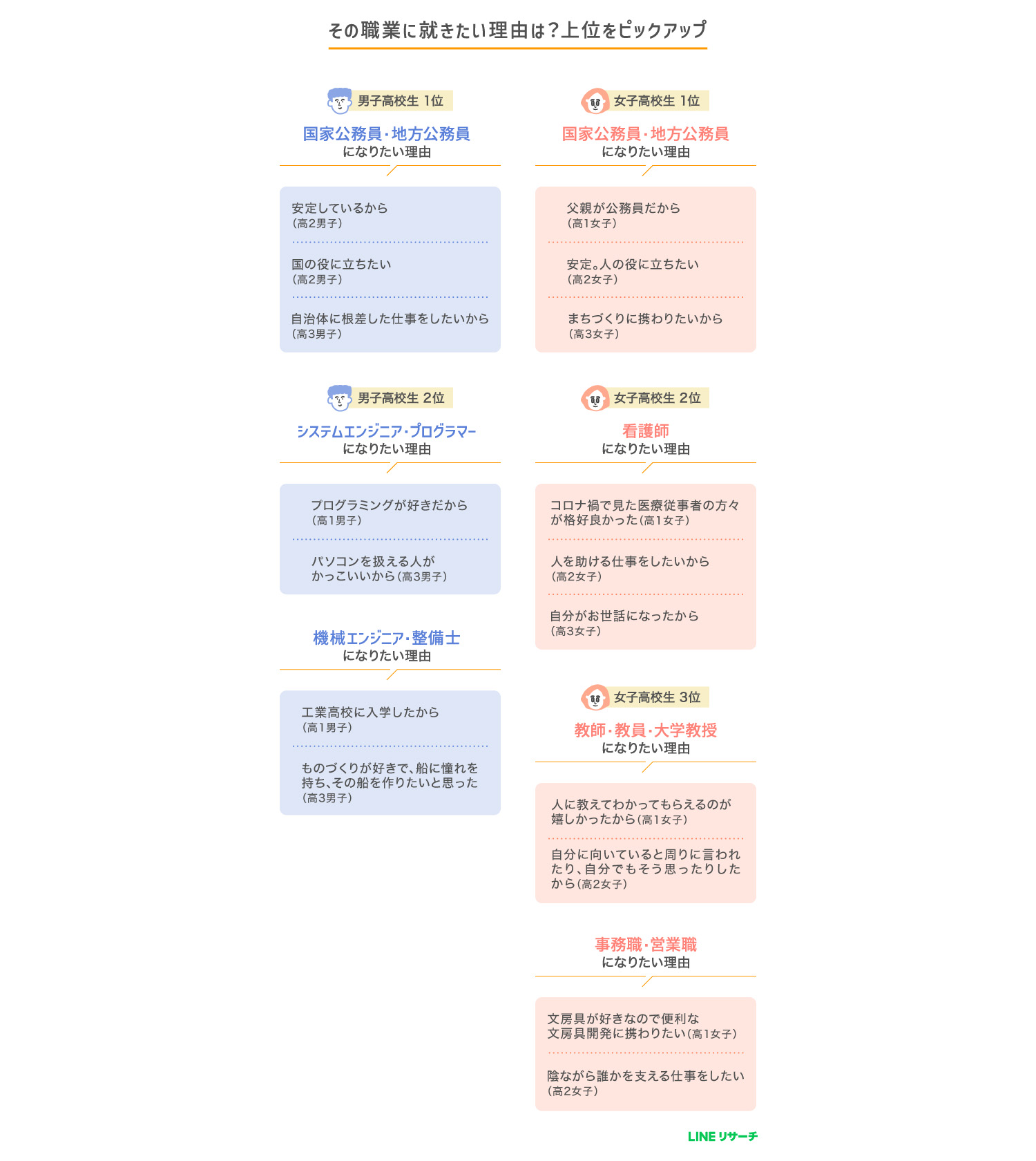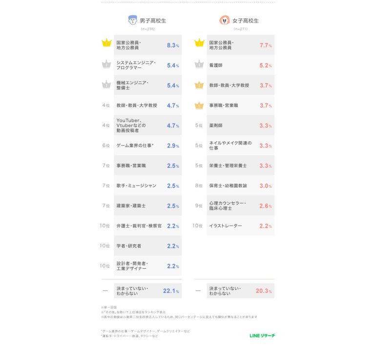 高校生では、男女ともに1位は昨年と同じく「国家公務員・地方公務員」となった。男子高校生の2位は同率で「システムエンジニア・プログラマー」「機械エンジニア・整備士」。どちらも昨年からランクアップしている。