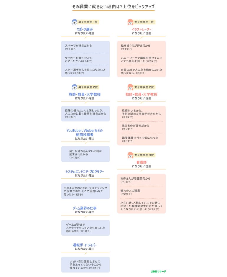 中学生のなりたい職業TOP3に就きたい理由をみると、「スポーツが好き」「絵を描くのが好き」といった好きという純粋な気持ちや、「担任に憧れた」「お母さんが看護師」といった身近な人への憧れがきっかけとなっているようだ。