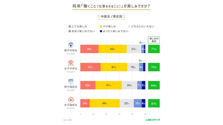 スマートフォン専用のリサーチプラットフォーム「LINEリサーチ」はこのほど、全国の中高生1034名を対象に、将来いちばんなりたい職業や、将来働くことをどのくらい楽しみにしているかに関する調査をし、その結果を発表した。