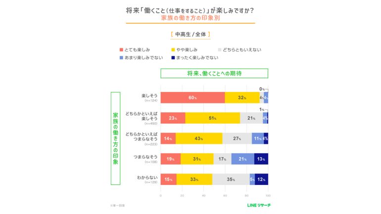 次に、中高生に家族(親、兄弟‧姉妹など)の働き方をみて、どのように感じるかを5段階で聞き、その印象別に、将来「働くこと(仕事をすること)」が楽しみかどうかを調査した。