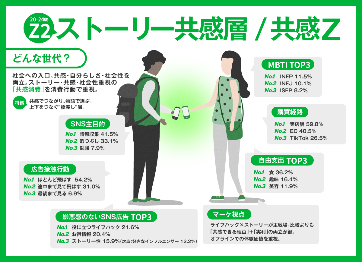 一方、Z2(20~24歳)は、商品やサービスにどのような背景や想いがあるかを重視する「ストーリー性重視消費」や、実際の体験価値を大切にする「経験重視消費」が最も高く、自分が共感できるかどうかが購買判断の軸となる傾向がうかがえる。