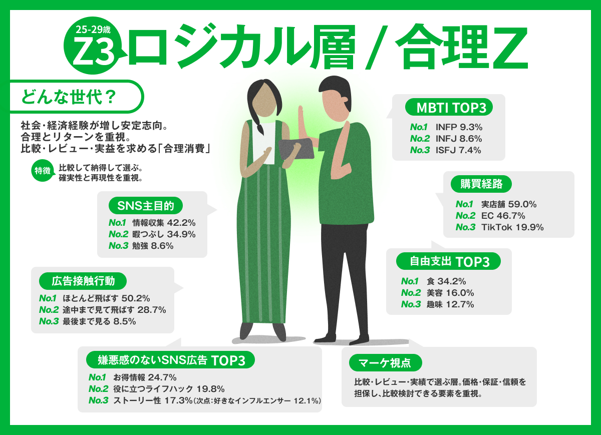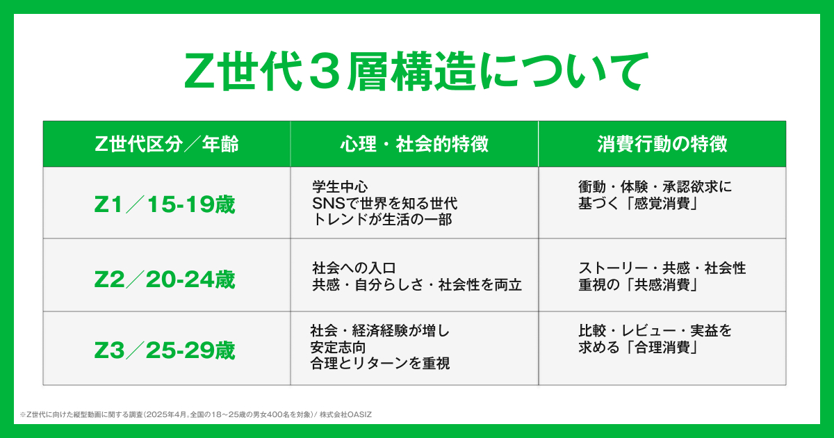 Z1(15~19歳)はトレンドや勢いを起点に直感的に行動する「トレンド層」、Z2(20~24歳)は商品やサービスの背景やストーリーへの共感を重視する「ストーリー共感層」、Z3(25~29歳)は情報収集や比較を前提に合理性・納得感を求める「ロジカル層」として、それぞれ異なる価値基準で意思決定を行っている。今後、Z世代をターゲットとしたマーケティングやコミュニケーションにおいては、「Z世代向け」という一律の設計ではなく、どの層に向けた発信なのかを明確にした“3層Z設計”が重要になると考えられる。