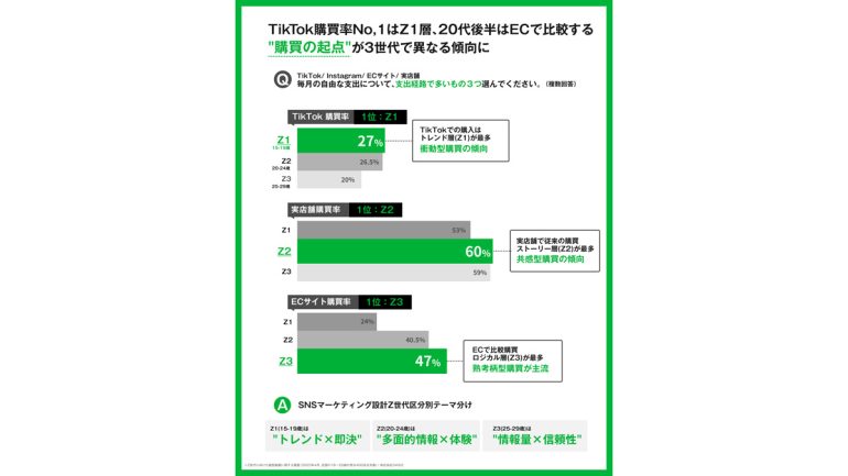 TikTok購買率No,1はZ1層、Z3層はECで比較。“購買の起点”が世代で異なる