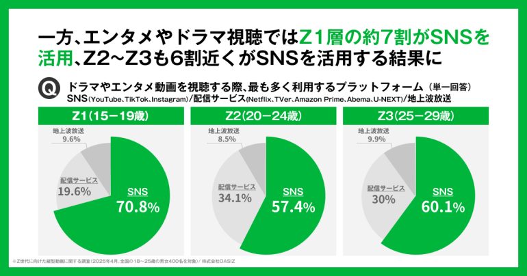 一方で、エンタメやドラマコンテンツを視聴する際の主要なプラットフォームを見ると、Z1では約7割、Z2・Z3でも6割前後がSNS(YouTube、TikTok、Instagram)を最も多く利用していることもわかった。