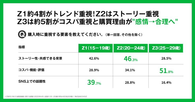 Z1約4割がトレンド重視!Z2はストーリー、Z3は約5割がコスパ重視と購買理由が感情→合理へ