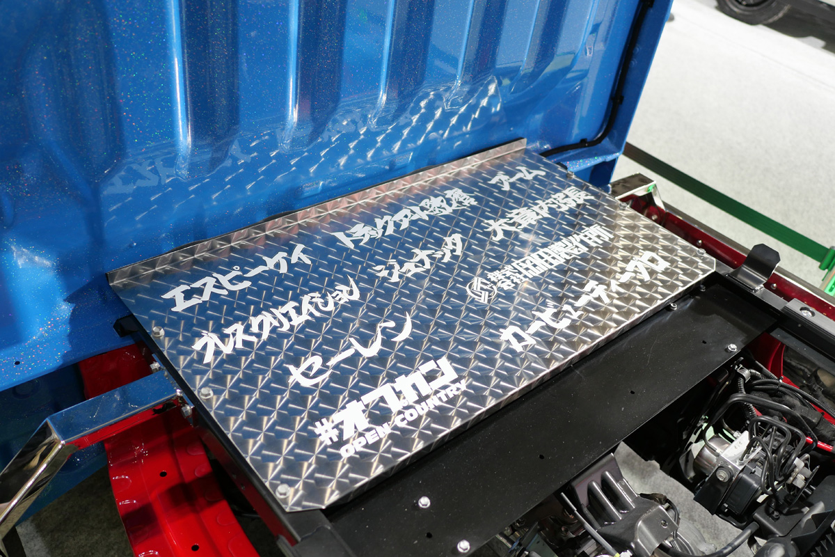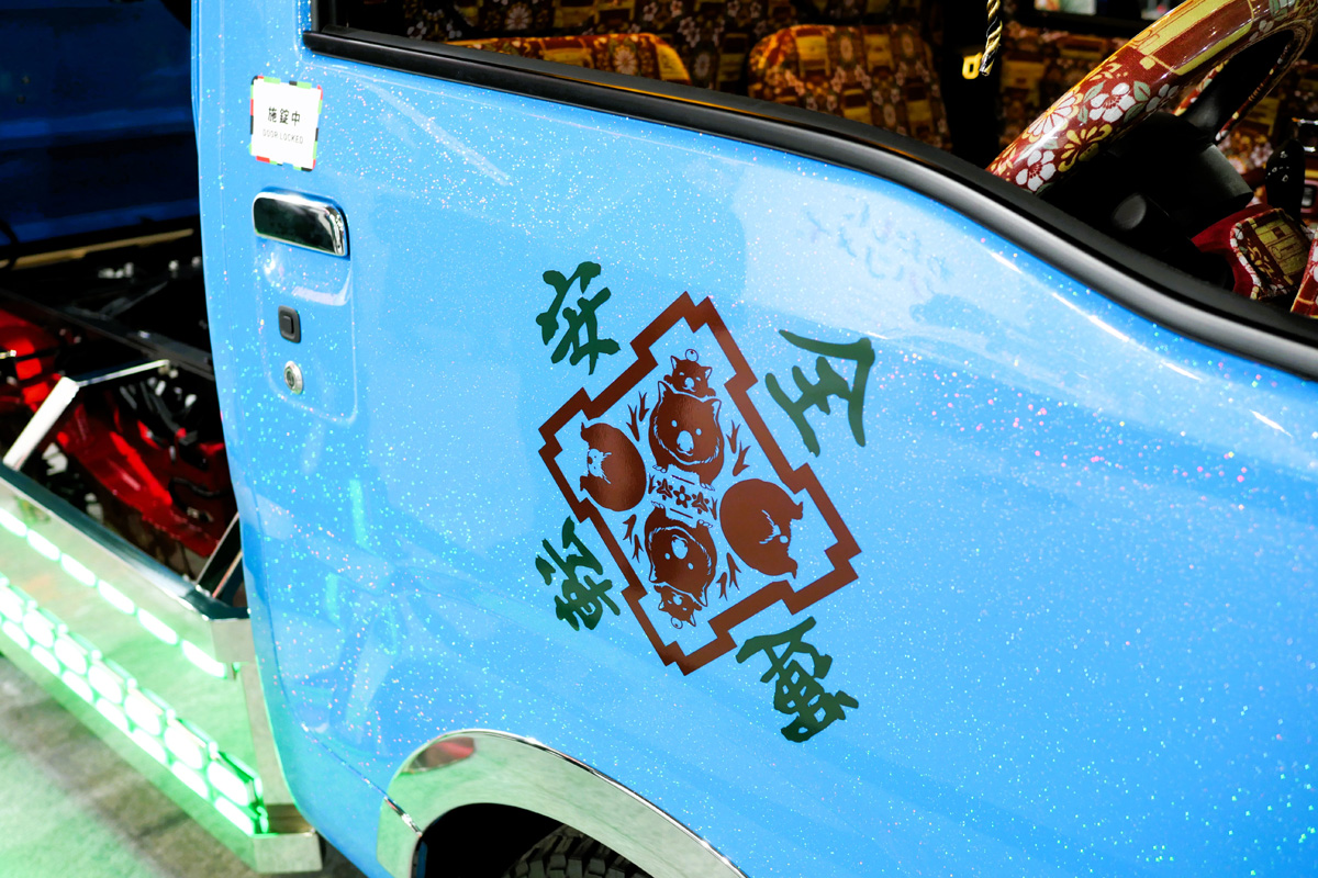 外装色については、ラメ塗装がアートトラック文化としてあることを学んだので、それを活かしました。歴史的にこういう青が主流だった時代があったようで、そこにリスペクトを込めて青にして、 ラメもなるべく大きなラメでレインボーラメを吹いてもらってキラキラと目立つようにしました。通常のダイハツ車両では絶対ない仕上げですね(笑)