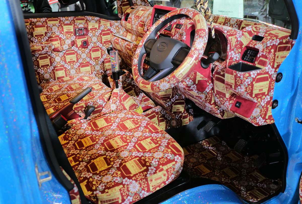 内装の部品で言うと、シャンデリアや背面のナイアガラはサイズを調整しつつ市販品を流用しています。ダイハツはおもろい会社だというアピールもしたいですし人を笑顔にすることができるのはやっぱりダイハツの良さかなというので、振り切ったものを出させてもらったという感じです。