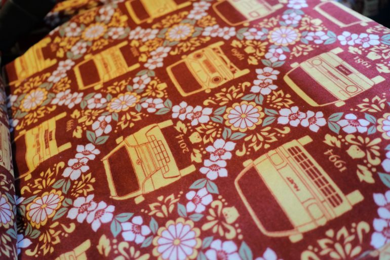 ダイハツの秦さん 内装の内張りはすべて今回、オリジナルのハイゼット柄で合わせています。描いているハイゼット柄は歴代の初代から現行まで10種類が並んでいるというのと、ふたつの花柄は、菊が中津市の、さつきツツジが池田市のそれぞれの市の花であることに由来しています。また遊び心として池田市にゆかりのある動物のウォンバットも入っています。