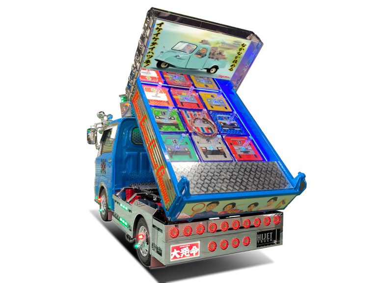 天井からぶら下がっているひもはホーンの引き手で、往年のアートトラックでは仲間とのコミュニケーションで使っていたようです。今回の制作にあたっては、『トラック野郎』シリーズもすべて観て勉強しました。映画を通じて改めてトラックとか働く車を通して人と人との繋がりとか、 仕事への誇りとか、結構なんだか怖いイメージがあったんですけど、人を思いやる心みたいなのがあるんだなと思ったので、 それを今回形にしたくて、いろいろ要素を散りばめたところです。
