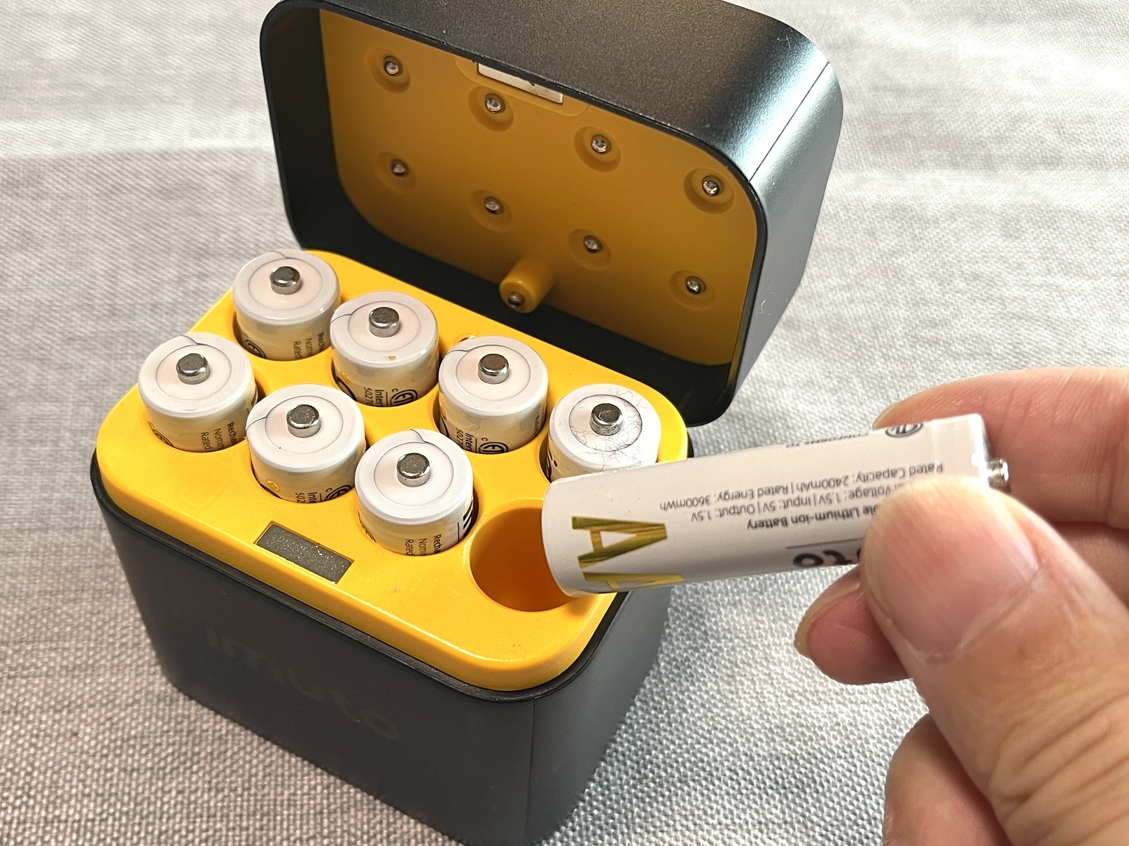 公称容量は3600mWh。単三形電池を必要とする多くの家庭用機器に対応できる容量であり、セット内容としては最大8本の充電池と、それらを同時に充電できる専用ケース型充電器が付属する。この充電器は、単なる給電装置ではなく、充電池をまとめて保管できるケースとしても機能する点が本製品の特徴の1つと言える。充電池と充電器を一体化することで、管理のしやすさと使い勝手の向上を目指した製品であり、使い捨て電池からの切り替えを検討している人にとっても導入しやすい構成となっている。