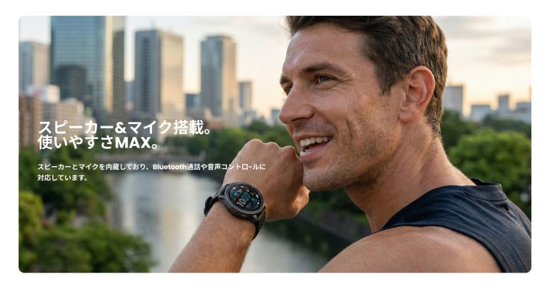 スピーカーとマイクを内蔵し、Bluetooth通話に対応。スマートフォンを取り出さなくても、ウォッチ上で着信に応答し、そのまま相手と通話できる。