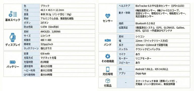 658mAhの大容量バッテリーを搭載し、通常使用で最大25日間の連続使用が可能なほか、ヘビー利用でも最大13日間、GPSモードでも最大64時間の稼働を実現。この性能は、同価格帯(3万円以下)のスマートウォッチとしては非常に優れており、多くの競合製品が1~2日程度のバッテリー寿命にとどまる中で大きな差別化ポイントとなっている。また、充電方法はマグネット充電で、わずか2時間で満充電となり、頻繁な充電が不要となることで、ユーザーはより快適でストレスフリーな体験を得られる。