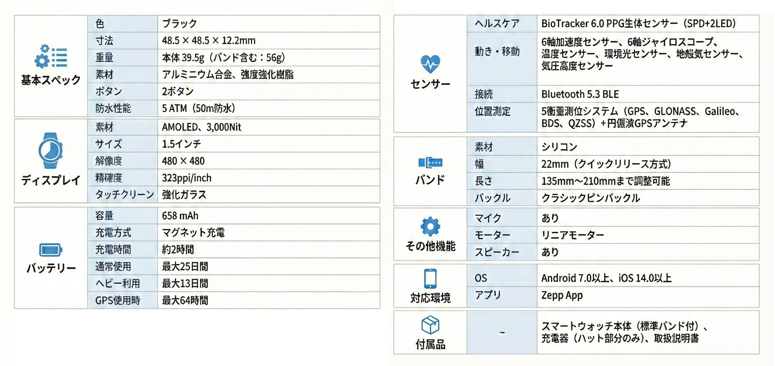 本製品は、「Activeシリーズにおいて、ユーザーから要望があった機能とスペックをMAX搭載した」と謳うモデル。1.5インチAMOLED大画面ディスプレイや、658mAhの大容量バッテリー、4GBの大容量ストレージを搭載し、スピーカー・マイクも内蔵。さらに、GPT4.oを統合したAI音声操作システム「Zepp Flow」も搭載する。