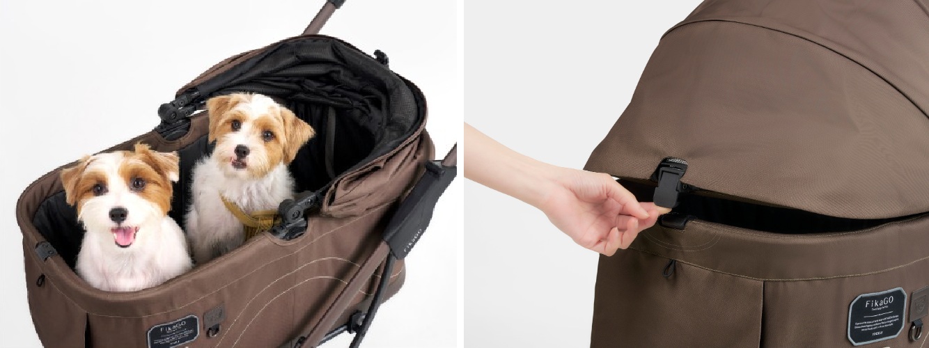 また、キャビン内寸はW330×D660×280mmと、広々としたキャビンサイズなので、中型犬でも小型犬の多頭でもゆったりと乗せることが可能。さらに、前後どちらからでも開閉できる幌は、毛の長いペットにもやさしい「バックル固定」を採用する。