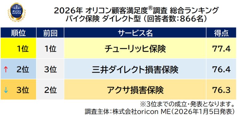 【東京海上日動火災保険】が3年連続の総合1位を獲得した。評価項目別(全7項目)では「加入・更新手続き」「商品内容の充実さ」「保険料」「事故対応」「調査・認定結果」「受取額・支払いスピード」の6項目で1位となった。また、年代別「30代以下」「60代以上」と排気量別「排気量125cc以下」「排気量126~250cc」「排気量251cc以上」でも1位を獲得している。