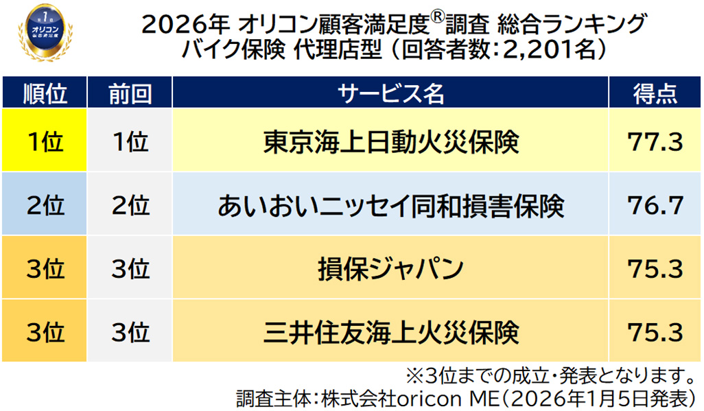 【東京海上日動火災保険】が3年連続の総合1位を獲得した。評価項目別(全7項目)では「加入・更新手続き」「商品内容の充実さ」「保険料」「事故対応」「調査・認定結果」「受取額・支払いスピード」の6項目で1位となった。また、年代別「30代以下」「60代以上」と排気量別「排気量125cc以下」「排気量126~250cc」「排気量251cc以上」でも1位を獲得している。