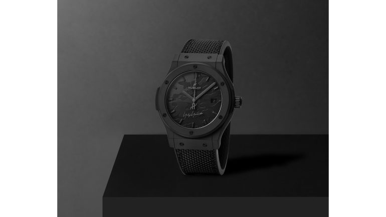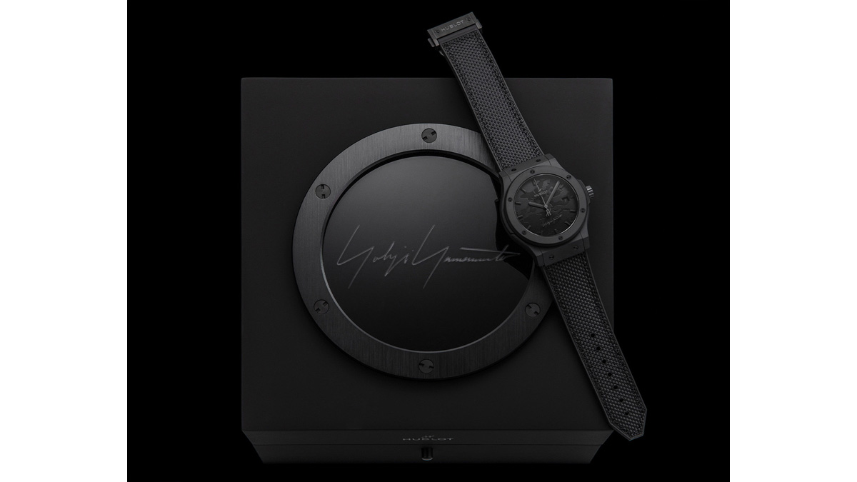 ファブリックとラバーを組み合わせたストップは、デザイナーの触覚的なクチュールとウブロの技術的な精度を反映した。300個限定、オールブラックのボックスには、ヨウジヤマモトのシグネチャーロゴが刻印されている。