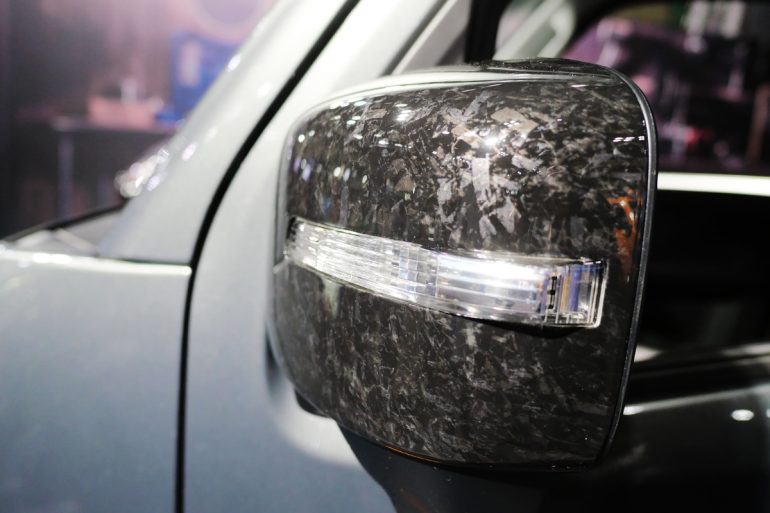 フロントマスクのカスタマイズポイントはバンパー、グリル、フードガーニッシュを押し出しの強い造形に変更し、加えてカラーリングをフォージュド(積層)カーボン調の加飾模様とピアノブラックのコンビネーションでよりタフなアウトドアギアの雰囲気に仕立てました。フォージュドカーボン調加飾は水圧転写フィルムと言う印刷技術を使い奥行き感のある柄に仕上げました。