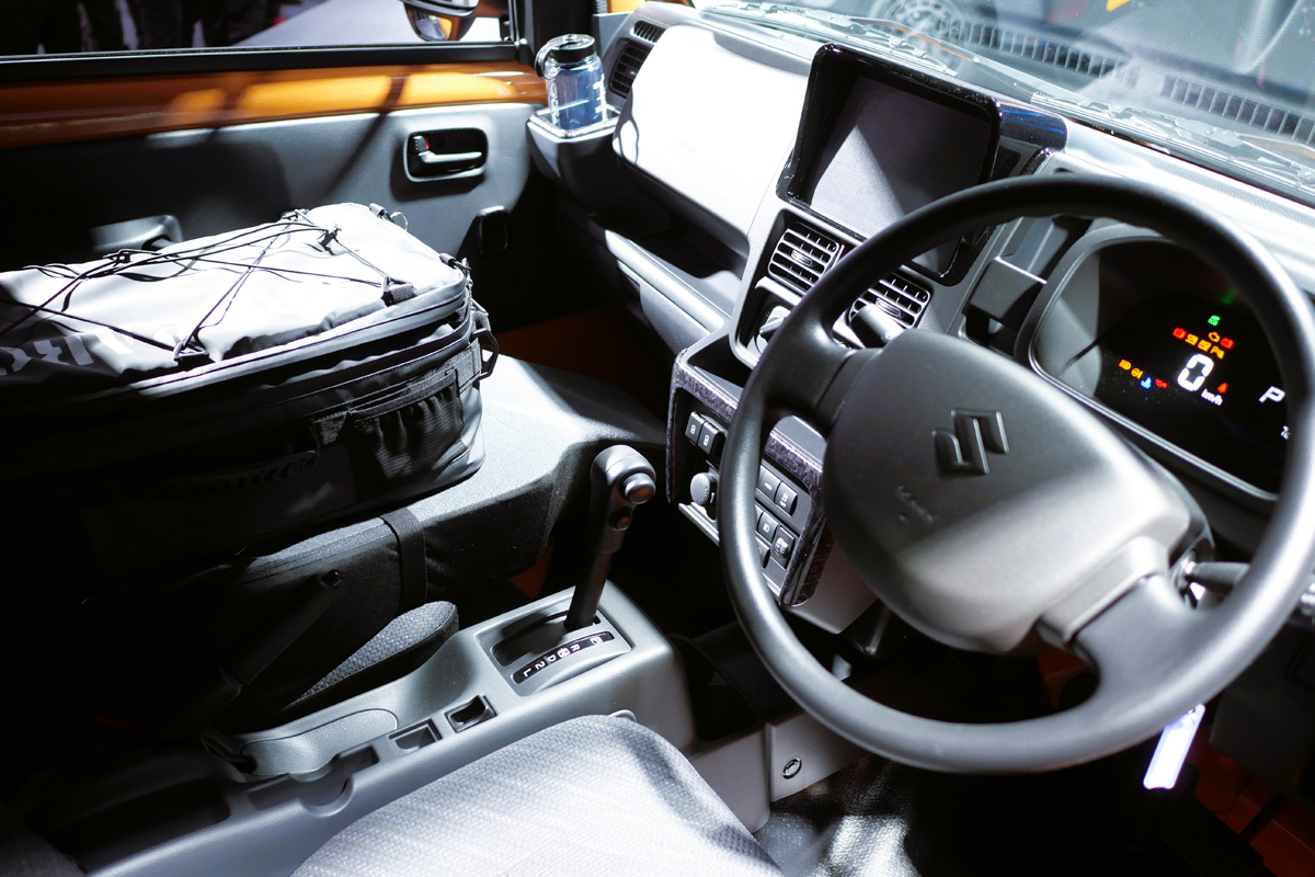 ボディカラーのオレンジは、何十種類といろんなプレートを作って、デザイナーが光を当てた時の見え方などをいろいろ検討して決定したものです。今回のショーモデルに選んだのは、この色が黒とすごく相性がいいからです。色自体は2025年8月から新色としてスーパーキャリイに追加したオレンジですが、いずれこういうような黒との相性が求められる前提で選ばれた色でした。本来マイナーチェンジを期に投入する予定だったのですが、「新色だから早く入れよう!」と前倒しした経緯があります。ただ当初は反応が薄かったのですけど、新型スーパーキャリイを展示すると「いいじゃん、いいじゃん!」となり間もなく人気色に。だからスーパーキャリイのオレンジは結構な割合で受注が入っています。