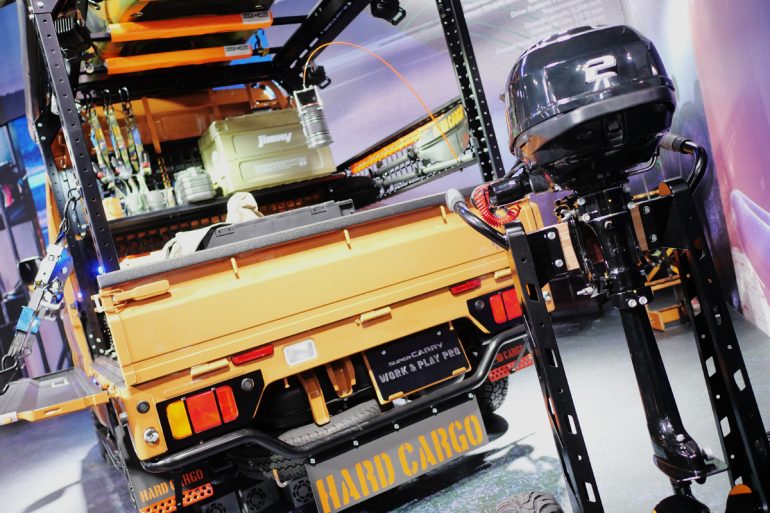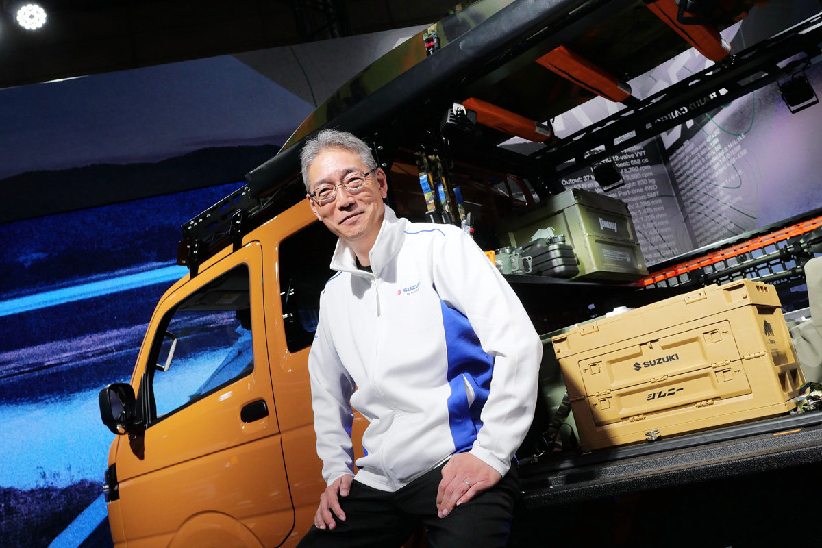 スズキの働く車の代表選手「キャリイ」のトラック展示を見ていこう。ご担当はスズキ「スーパーキャリイ ワーク&プレイプロ」開発担当の伊藤ニ三男さんだ。