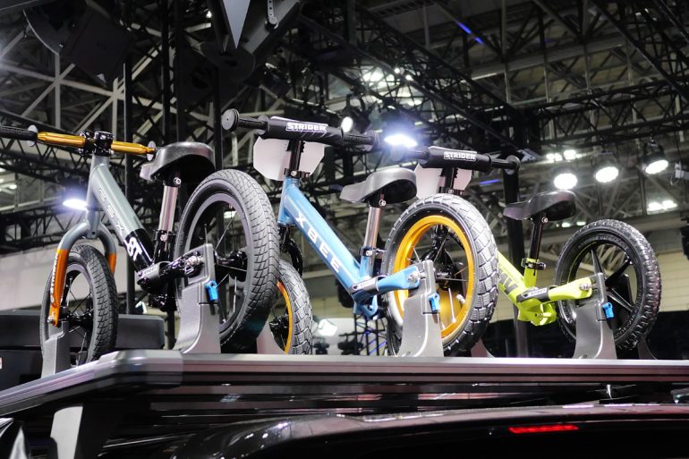 装着パーツとしては大型のフラットルーフキャリアを用意しました。その上に市販品のルーフボックスやサイドカーテンターブといったものを載せております。後方にはストライダー(ペダルレスの足こぎ自転車)を今回4台製作しまして、3台はルーフの上に固定できるような専用のアタッチメントを製作して取り付けております。
