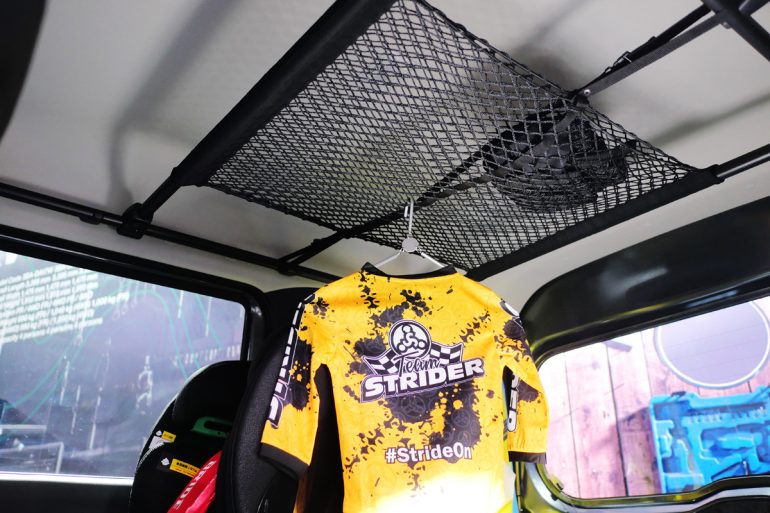 車内の天井キャリアは用品設定しているルーフネットを黒く仕立てた特注品で、通常品はシルバー仕上げでの販売となります。
