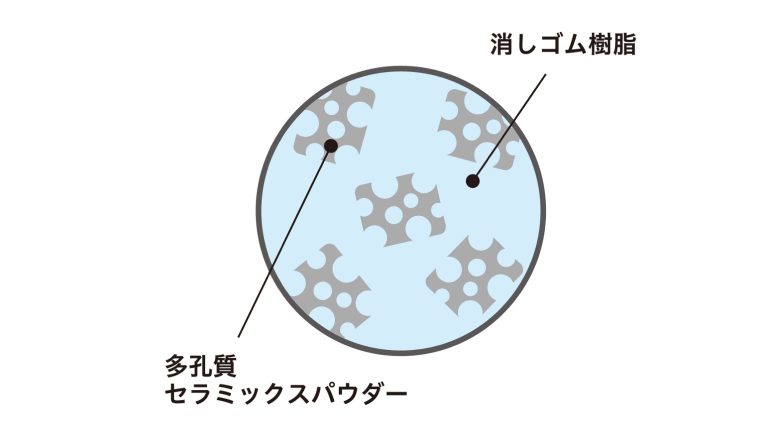 「富士山消しゴム」は、1989年に発売を開始したロングセラー消しゴム「エアイン」と同じ消しゴム樹脂を採用。多孔質セラミックスパウダーが無数のカドを生み出すことで、〝常にカドで消すような軽く快適な消し心地〟を実現している。