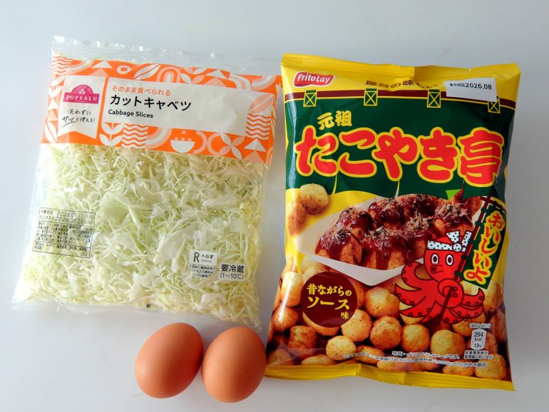 ○スーパーとかで売ってるカットキャベツ:1袋。写真は内容量130グラムの商品ですんで、130グラム前後の内容量のヤツを一袋。